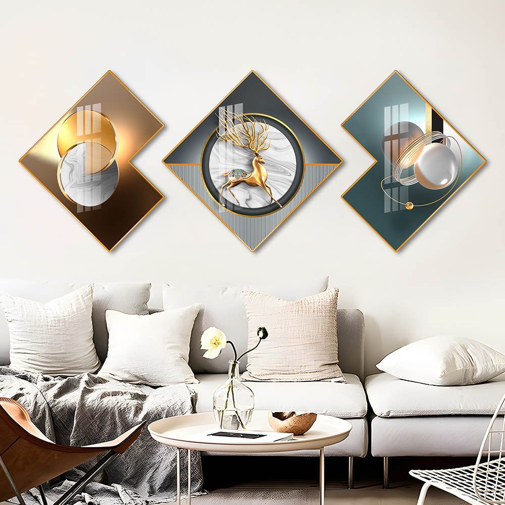 This striking 3‑piece crystal porcelain artwork brings together symbolism, strength, and cosmic wonder. The set features a flowing infinity motif, a majestic golden stag at the centre, and a breathtaking universe design—each accented with shimmering gold and silver tones. Modern, luxurious, and deeply expressive, it’s the perfect statement piece for any contemporary home or office.