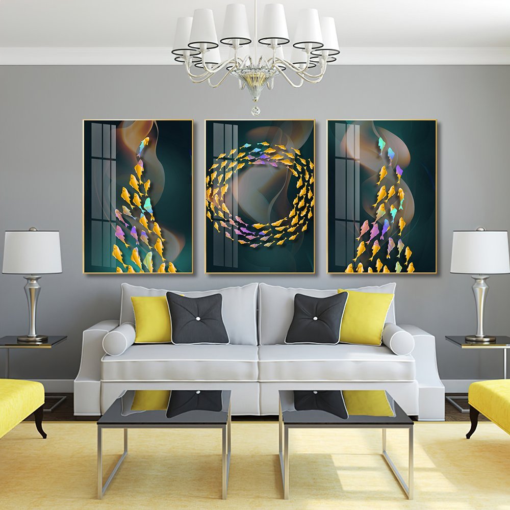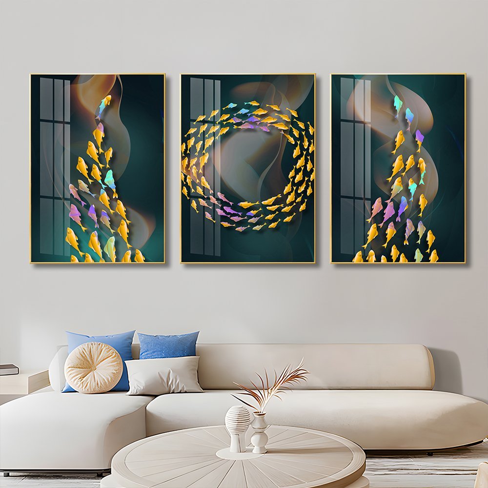 3 piece Beautiful Fish Abstract Crystal porcelain painting with Aluminum alloy frame and 5D Diamond