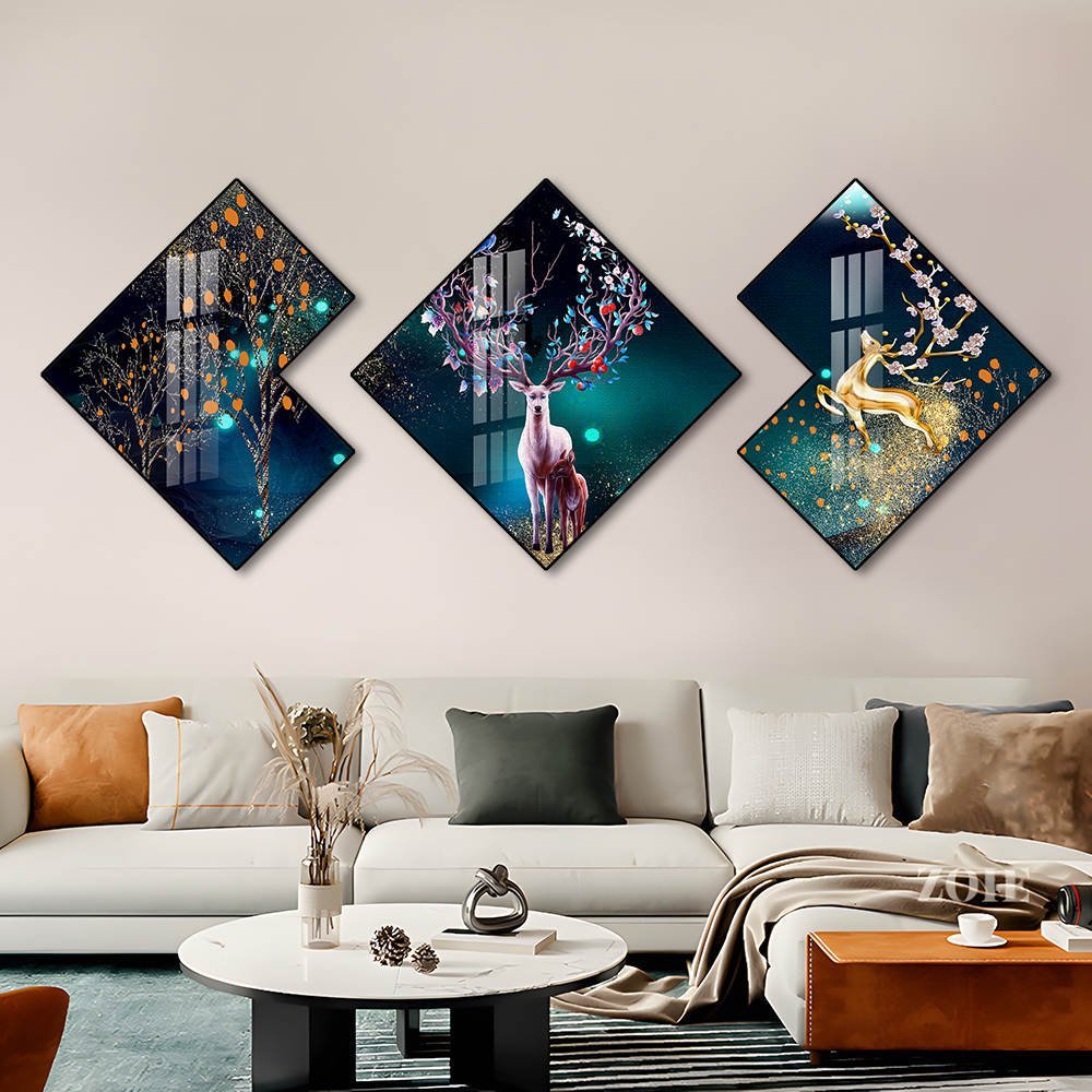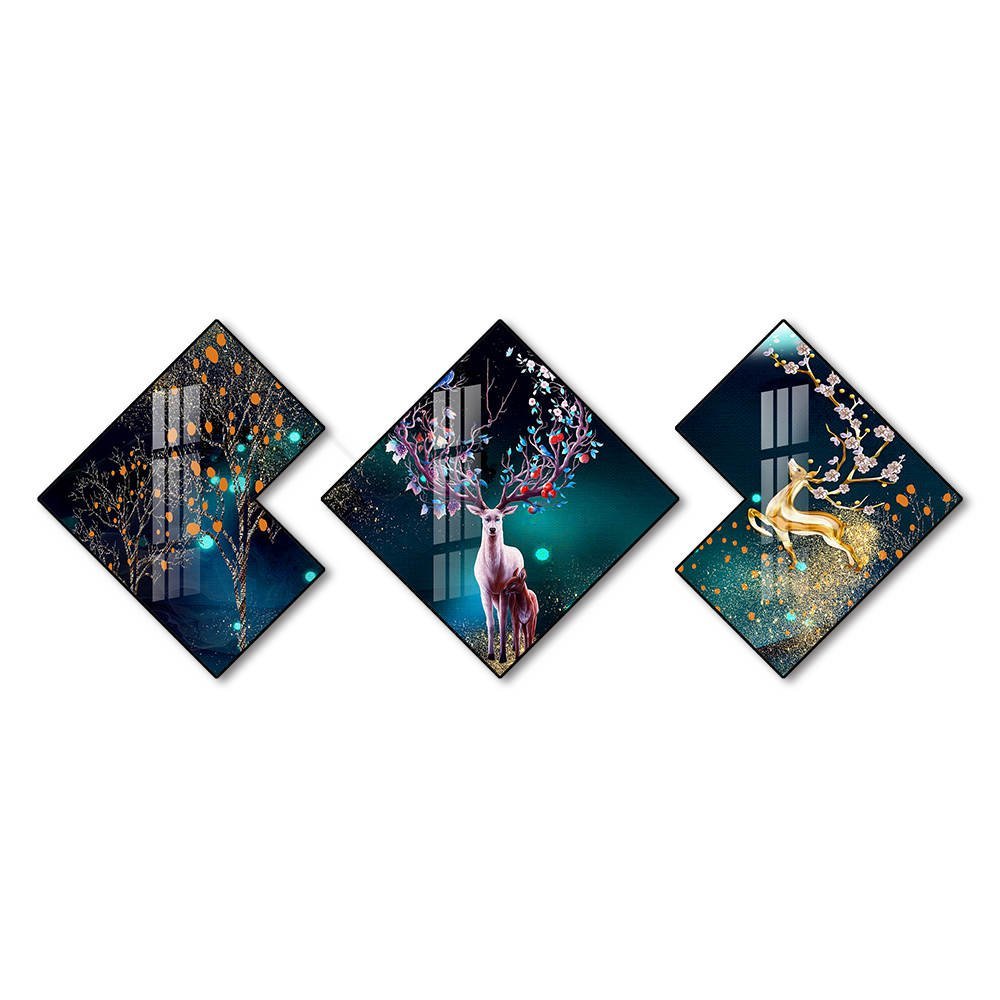A captivating 3‑piece crystal porcelain artwork set featuring a mystical emerald‑green forest. The first panel showcases an enchanted, shimmering tree, while the remaining two frames reveal graceful deer wandering through a magical woodland. The rich emerald finish and luminous detailing create an atmosphere of serenity and fantasy, making this trio a striking centrepiece for nature‑inspired and elegant interiors.