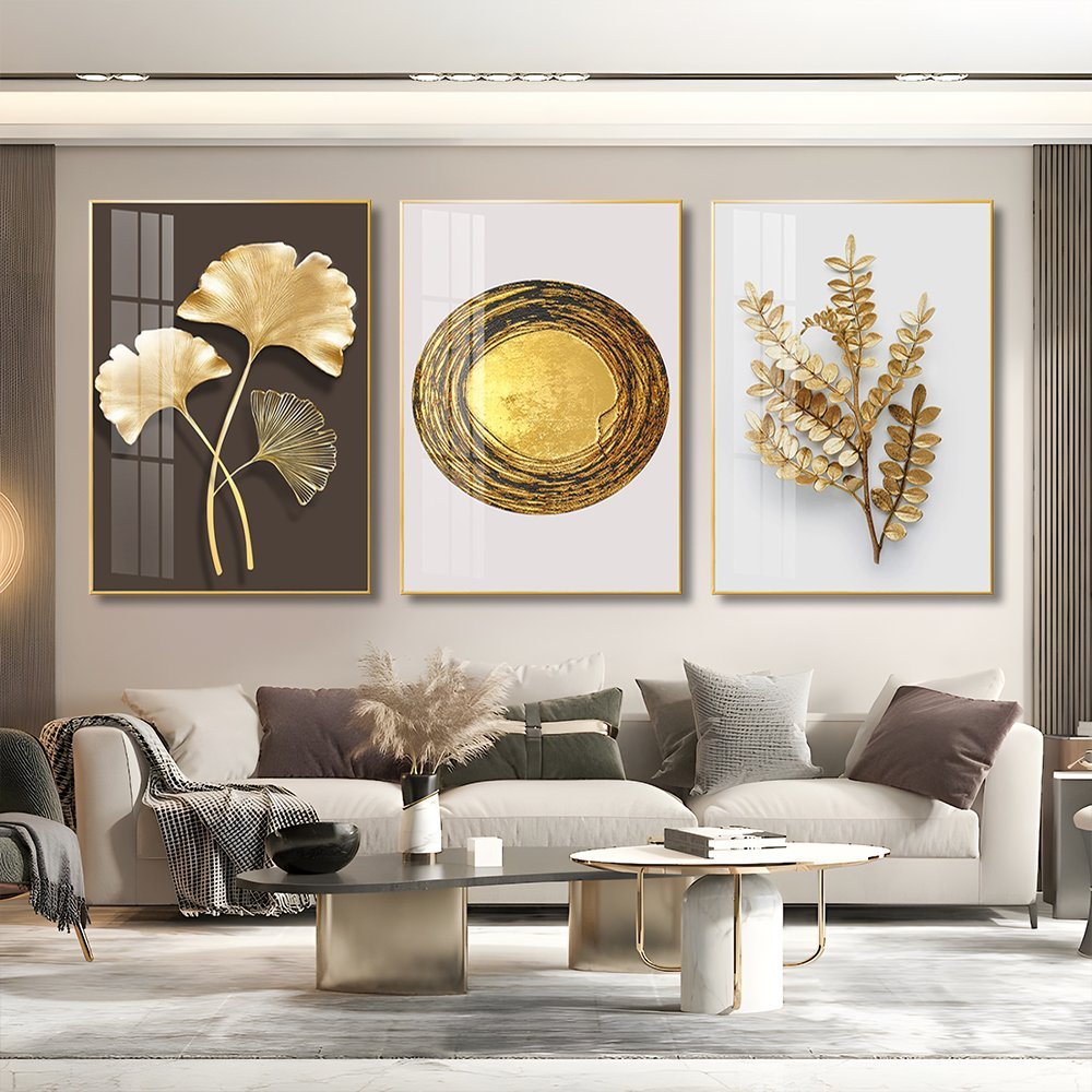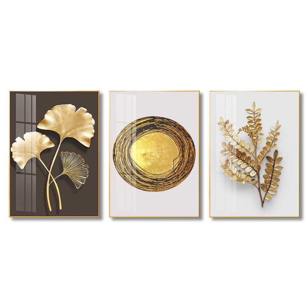 3 Piece Golden Nature Symbols Crystal porcelain painting Aluminum alloy frame