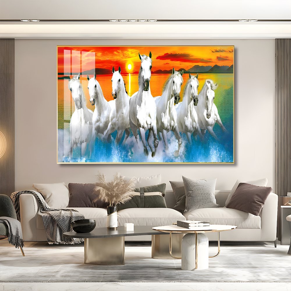 7 Running Horses Feng Shui Crystal porcelain painting Aluminum alloy frame