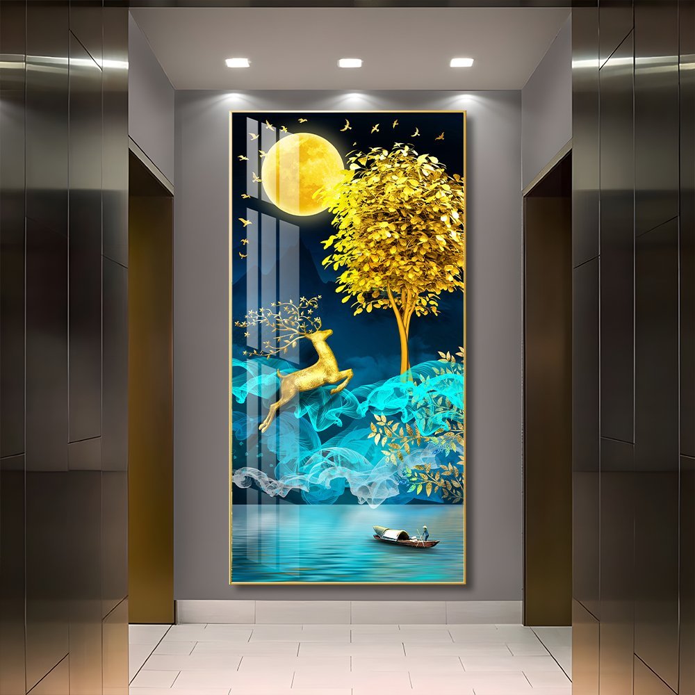 Bright Moon shining its Golden light on a Golden Deer and Golden Money Tree Crystal porcelain painting Aluminum alloy frame with 5D Diamond