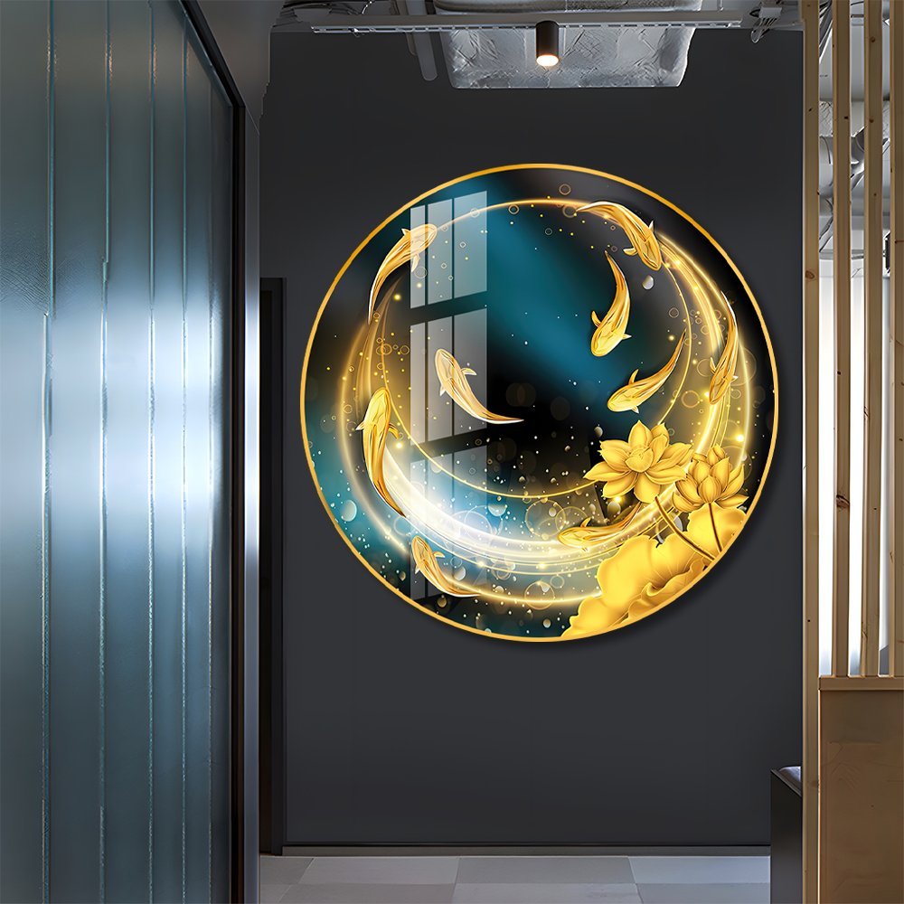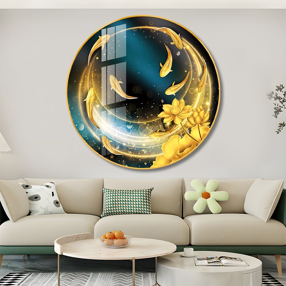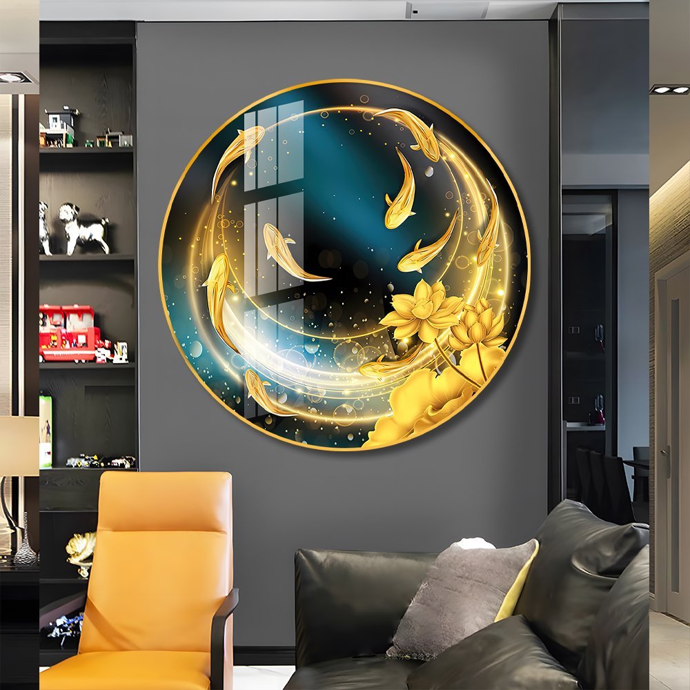 A circular crystal‑porcelain frame showcasing a cluster of golden koi gliding in harmony, symbolising prosperity, balance, and continuous good fortune. The lustrous gold detailing catches the light beautifully, turning this Feng Shui‑inspired piece into an elegant focal point that brings calm, abundance, and positive energy into any space.