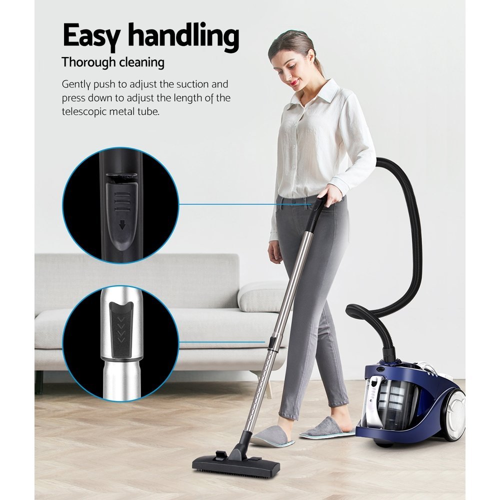 The convenience of bagless vacuuming with the power of effortless cleaning. Such is the Devanti Bagless Vacuum Cleaner that makes light work of even the toughest cleaning tasks. With its 2200W suction power, the vacuum cleaner utilizes a multi-cyclonic system that separates large debris from fine dust. The dust is filtered through a HEPA filter that eliminates up to 99.97% of allergens. Clearing the dust is an easy matter of pressing the release button to remove the lid and dust container and pouring the contents away. The HEPA filter is also washable and reusable. The vacuum cleaner comes with a retractable cord for easy mobility, a 360° rotatable hose and a telescopic stainless steel handle that can be fitted with different heads included in the accessories pack.