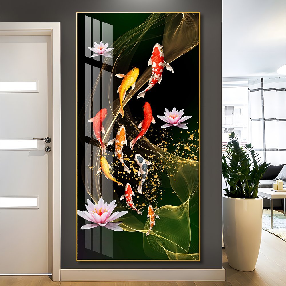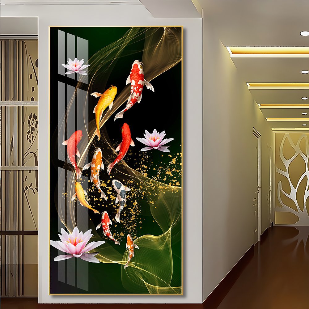 Nine Koi Fish and Pink Lotus Abstract Crystal porcelain painting Aluminum alloy frame with 5D Diamond