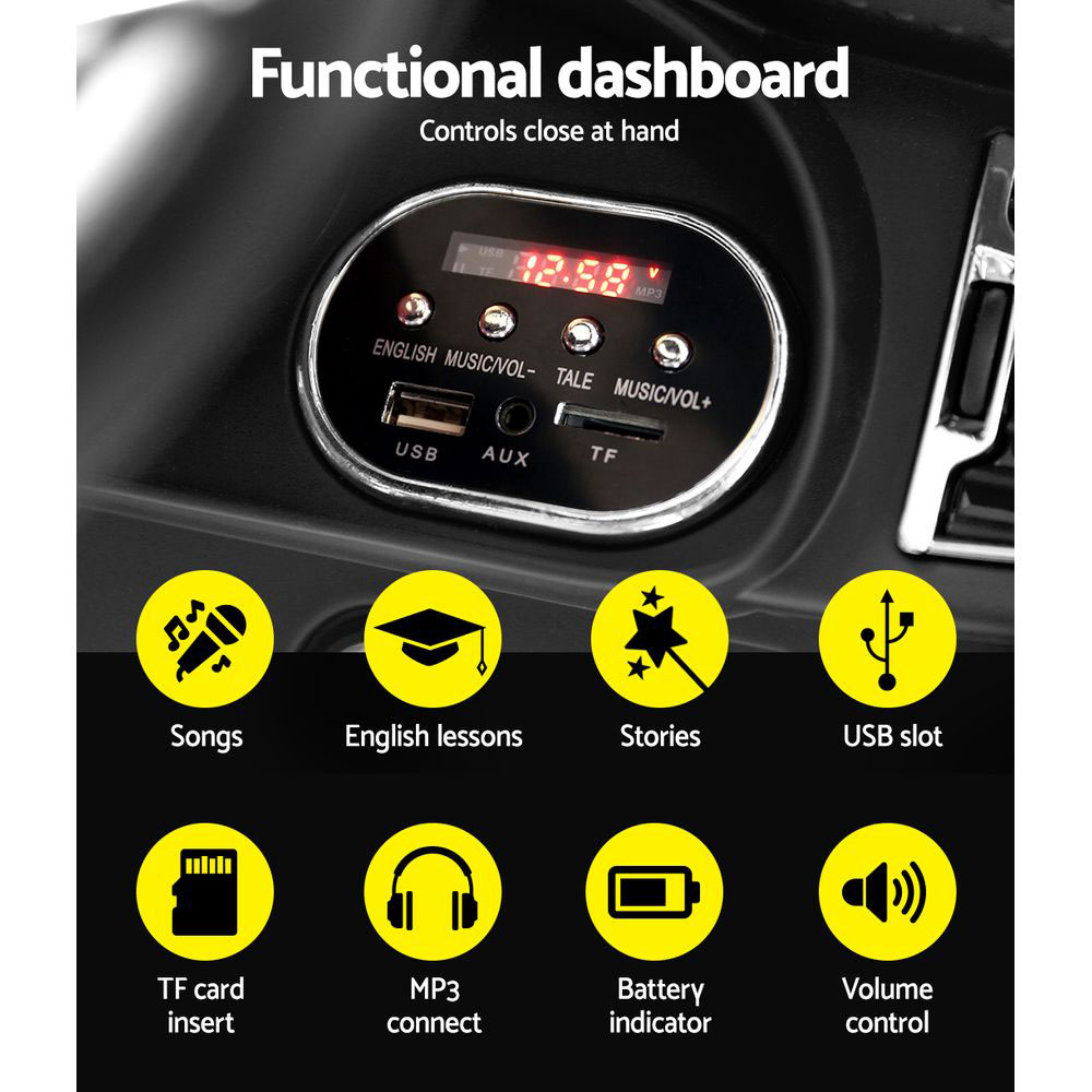 Our ride on BMW X5 is sure to impress your little driver with its looks, performance, and charisma. It boasts a luxurious and distinctive exterior design, brilliant finish that accentuates its sculpted lines, and a solid build. It has 4-wheel suspension for absorbing shock and ultimate smooth and comfortable ride, 10-spoke alloy wheels for a steady ride and gripping fun, anti-flat, and wear-resistant tyres for premium performance and smooth ride and a sports seat with a safety belt for safety and comfort. You can also play songs, English lessons, and stories. Plus, it has stylish working doors, stunning headlights for a clear and bright view and reverse lights for safety, and a functional dashboard with functions like horn, music, start button, forward/reverse/stop switch, and accelerator pedal for a real-like driving experience. Furthermore, the gradual acceleration and deceleration prevents sudden jerks or stops. The remote-control function and EN71 Standard Safety of Toys certification ensure the safety of the child.